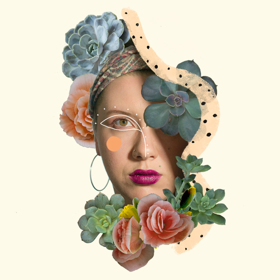 A digitally collaged self portrait made with Photoshop and Procreate.